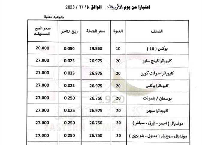 فيما يلي ملخص لأبرز أسعار السجائر بعد الزيادة: