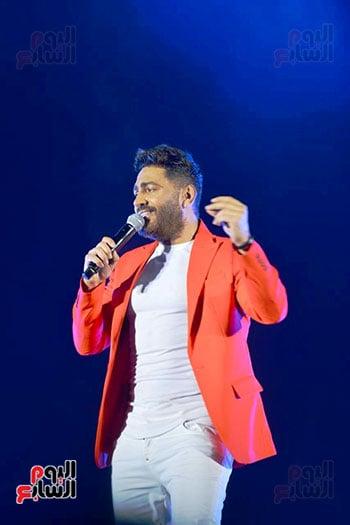 تامر حسني يثير حماس الجمهور بمهرجان العلمين من خلال أداء أغنية ارجعلي