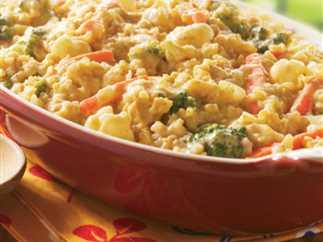- توزيع طبقات البشاميل فوق خليط الأرز والخضروات بشكل متساوٍ لإعطاء القوام الكريمي المطلوب.