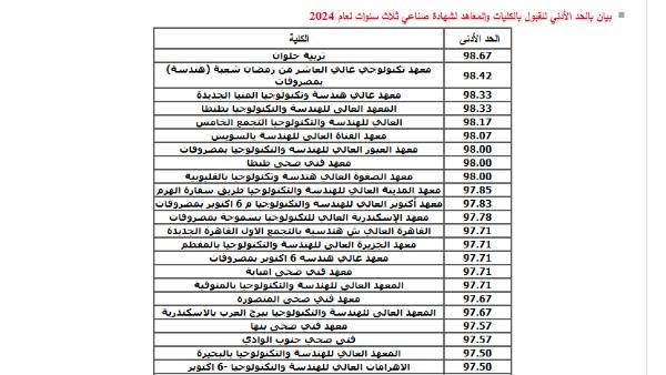 | الكلية / المعهد | الحد الأدنى المتوقع (%) |