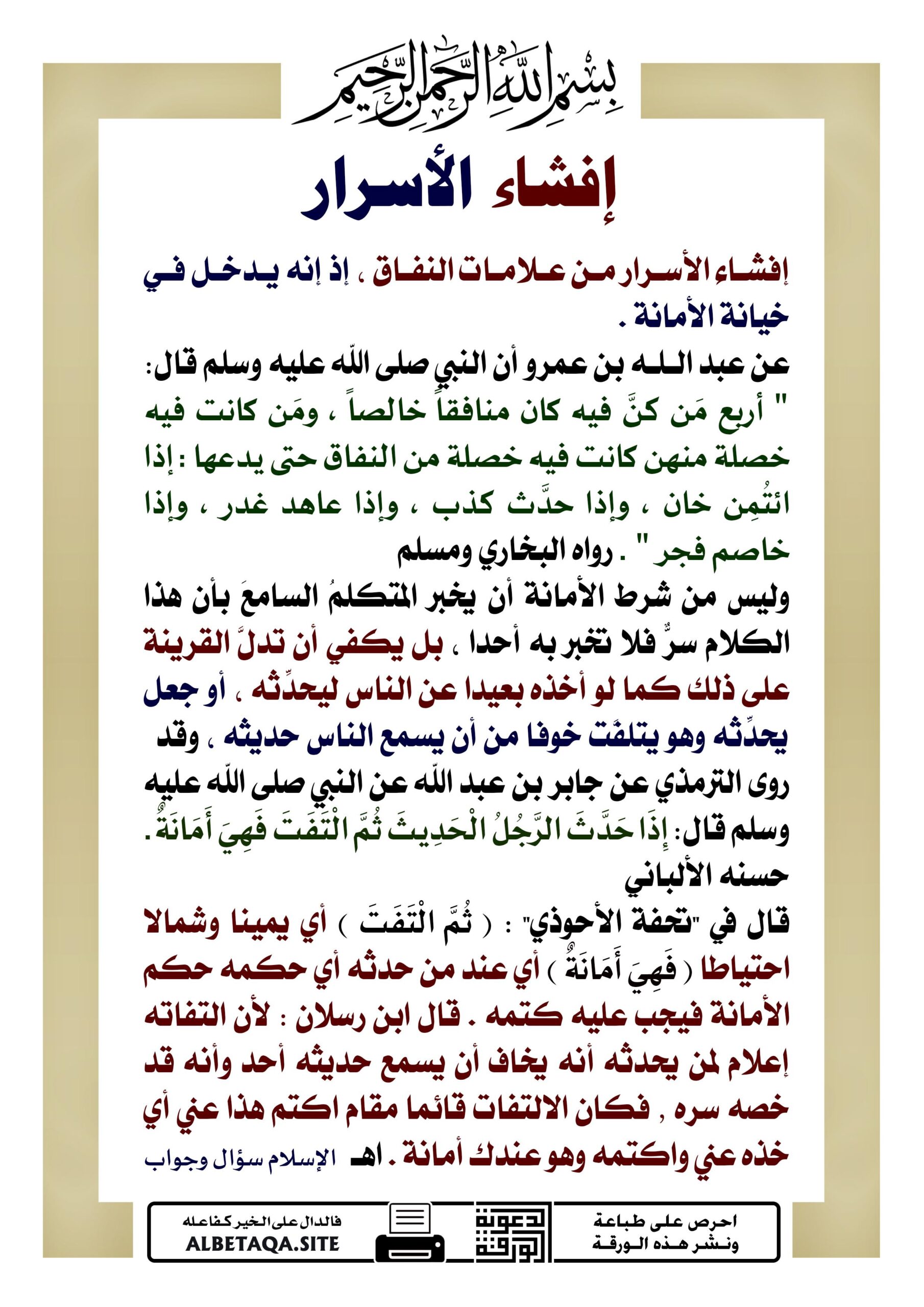 • الإفشاء غير المقصود: لا يُعتبر ذنبًا جسيماً طالما أنه تم بدون قصد، ويمكن للمسلم أن يستغفر الله ويعقد نيته بعدم العودة.